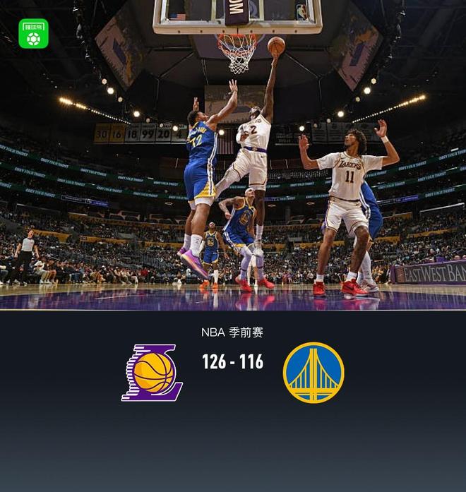 在此前的一场NBA季前赛中,主场作战的洛杉矶湖人以126比116战胜了金州勇士。本场比赛后,湖人取得了季前赛中的首场胜利,目前战绩为1胜2负;而勇士则是遭遇了季前赛中的首场失利,目