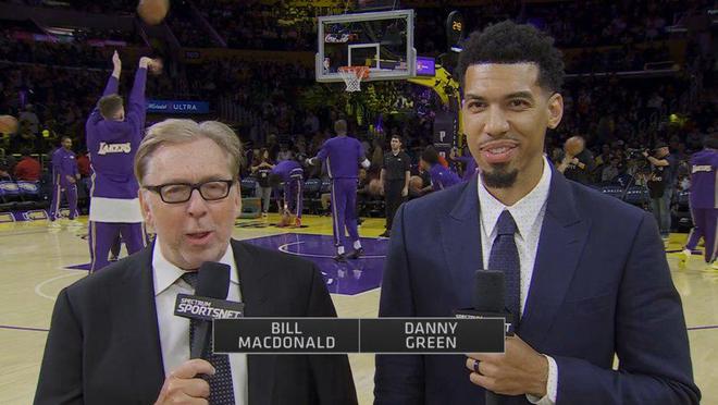 雷速体育10月13日讯 NBA季前赛,湖人主场迎战勇士。本场比赛,前湖人球员丹尼·格林现身场边担任解说工作。在解说间隙,丹尼·格林提到了在湖人夺冠的经历,他说:“虽然在这里有很